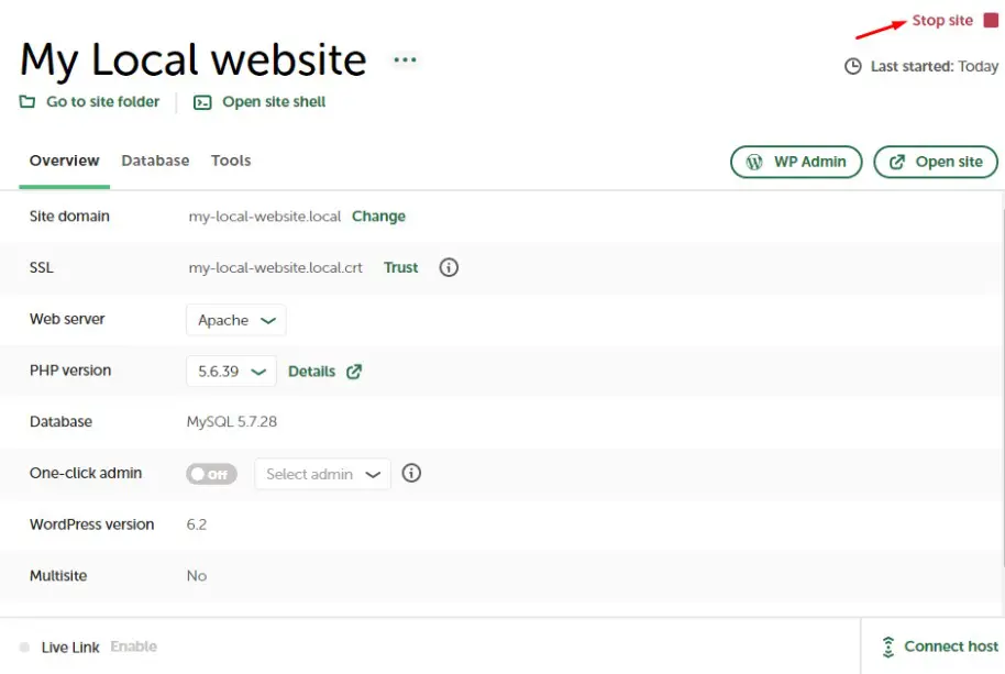 Once you have completed your editing tasks, it is essential to remember to stop the website from within the Local WP software. To do this, simply locate and click the ‘Stop site’ button.